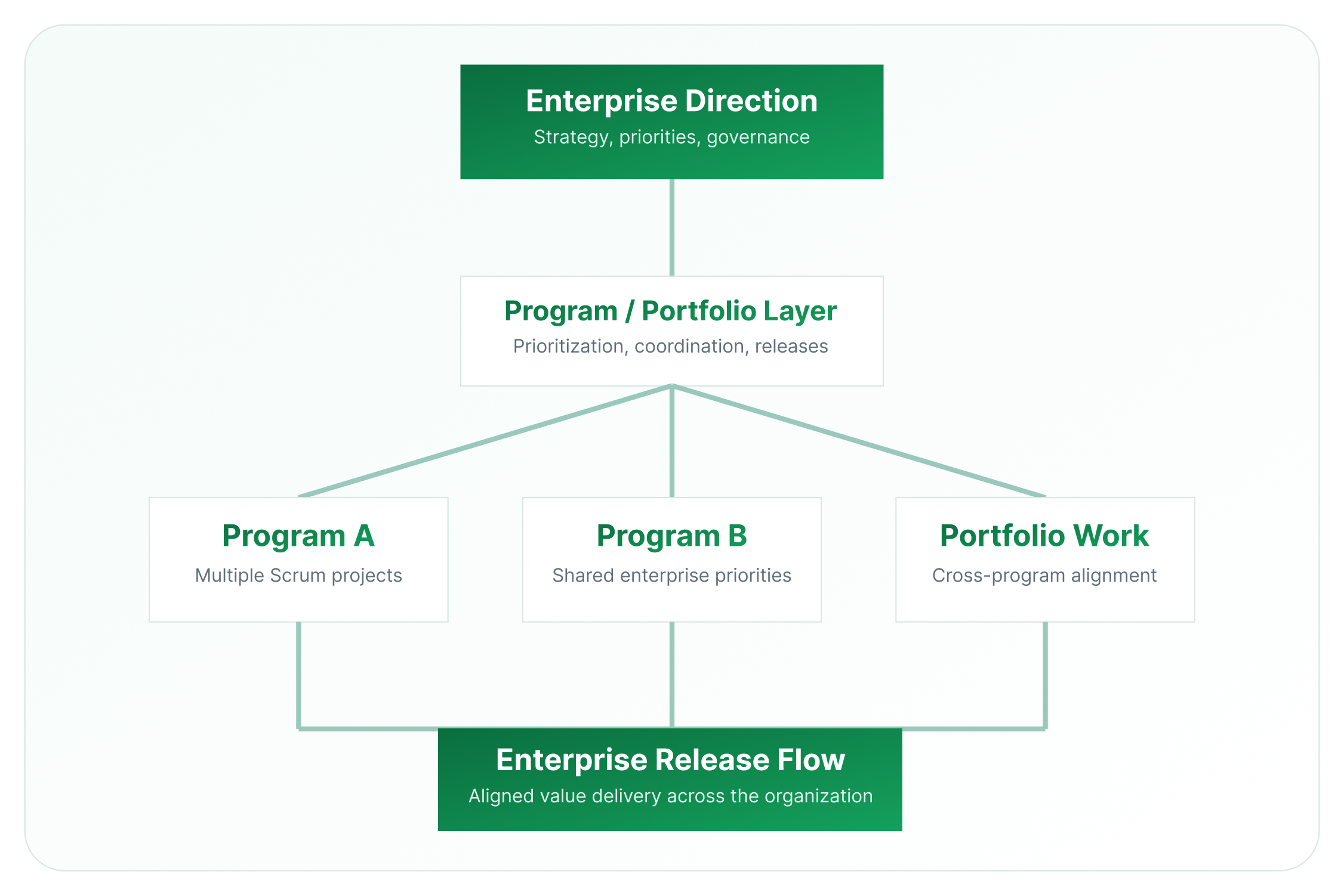 At the enterprise level, Scrum expands from team execution to coordinated program and portfolio management.
